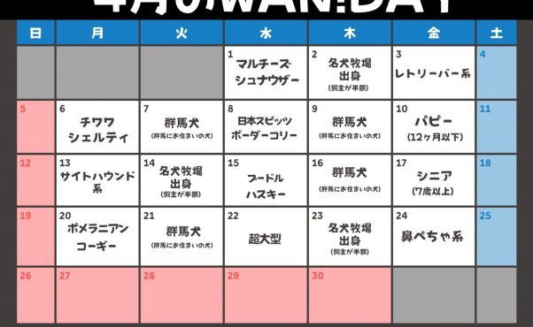 毎月のカレンダーに指定されたテーマに該当するワンちゃんの入場料が「半額」になります!